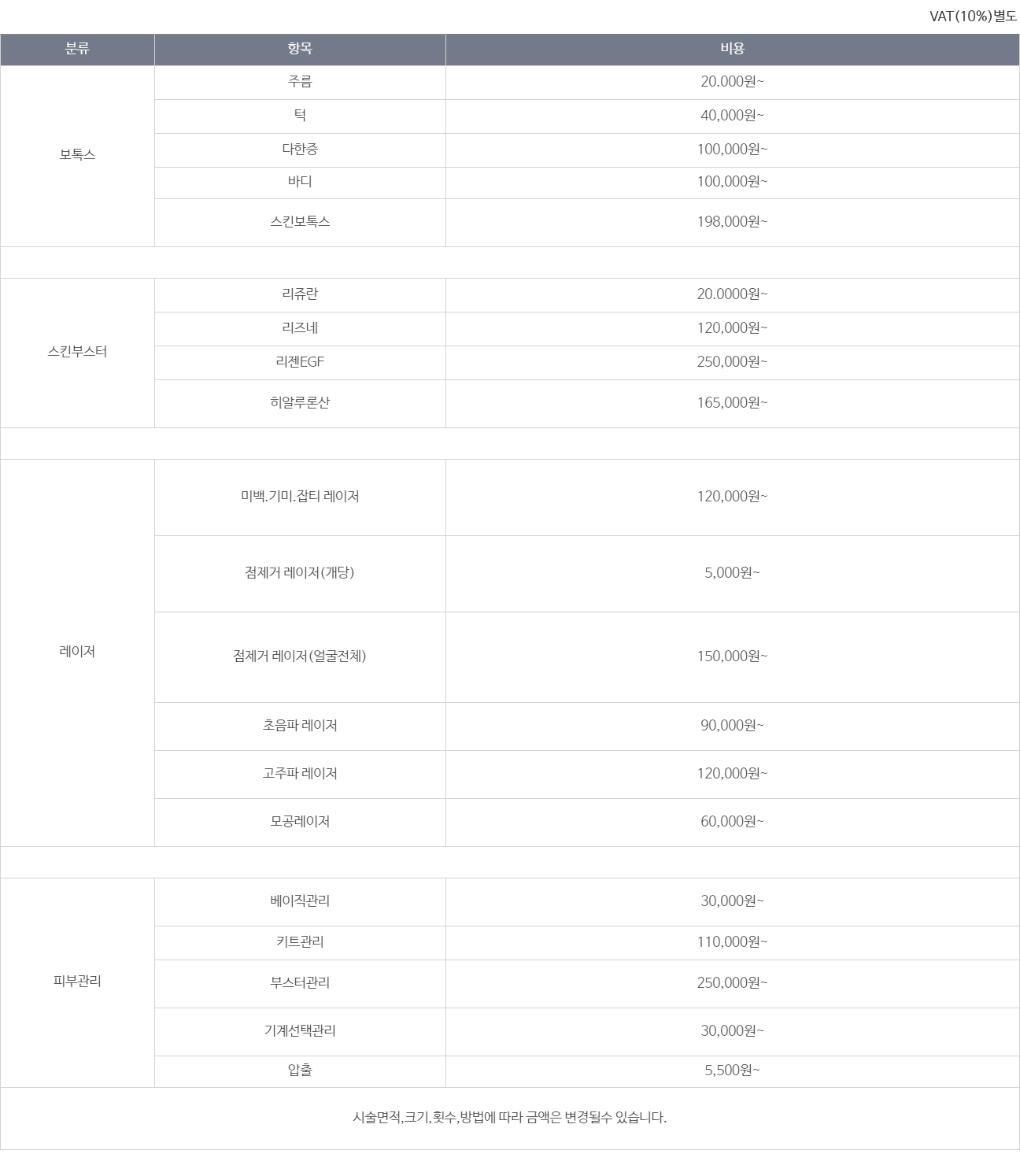 의료법 제45조 비급여 진료비용의 고지의무에 따라 비급여 항목과 금액을 공개합니다.